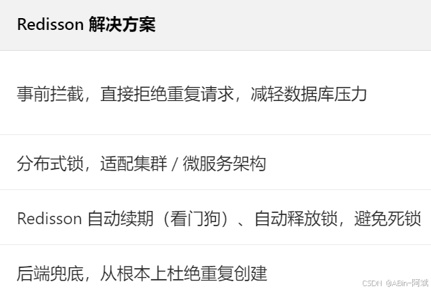 Redisson 基于 Redis 提供的分布式锁 / 分布式对象能力,能在事前拦截重复请求,是高并发场景下防重复的最优方案之一。