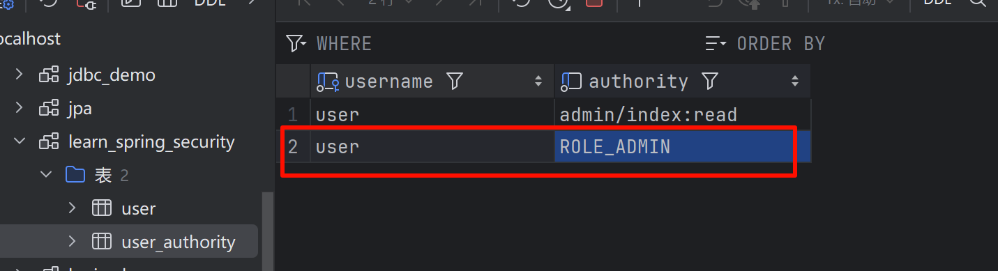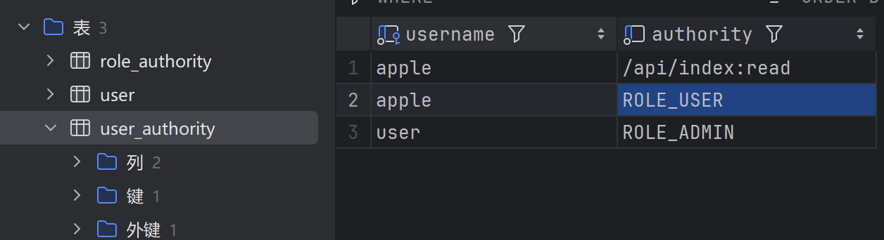 区别在于,表示角色的权限会有一个前缀,默认是 ROLE_,这也是为什么保存在数据库中的用户权限表中的数据会是: