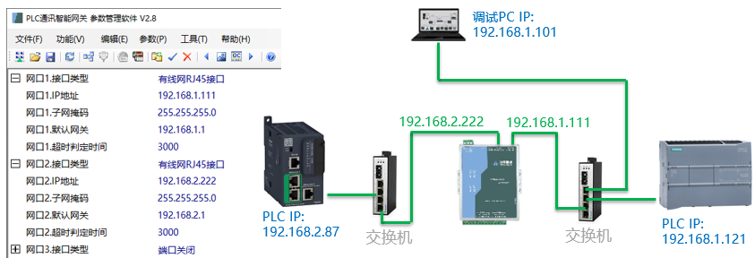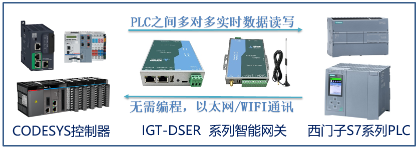本案例是CODESYS控制器标签(Tag)方式跟S7-1200PLC之间通讯,两种PLC在不同的网段,采用IGT-DSER智能网关,以下是设备连接关系和网络结构、及其对应的网络参数: