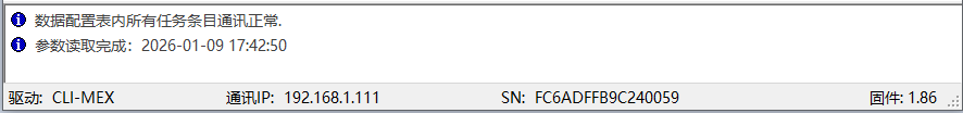 - 通过网关的参数配置软件读取网关参数(参数->从网关读取参数)后,看软件上状态消息区域显示的状态消息。以下是通讯正常时的状态消息显示: