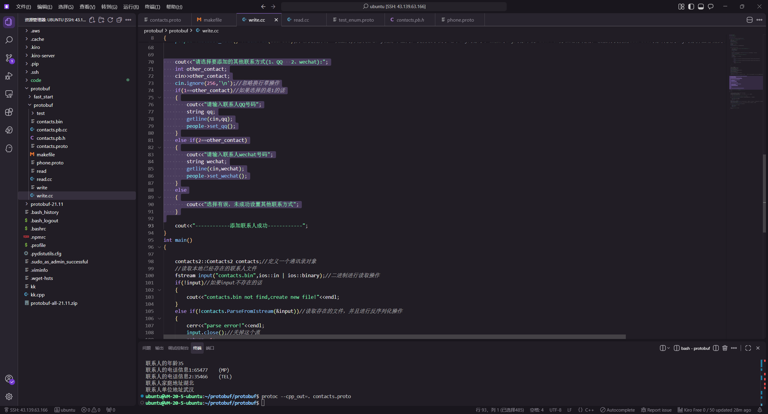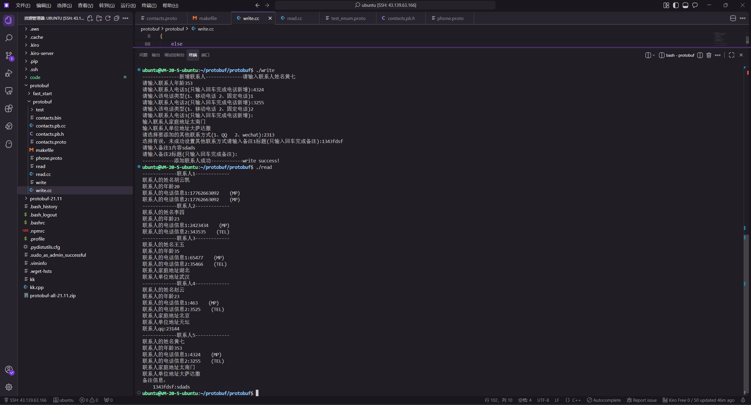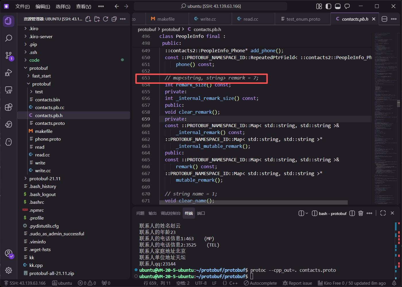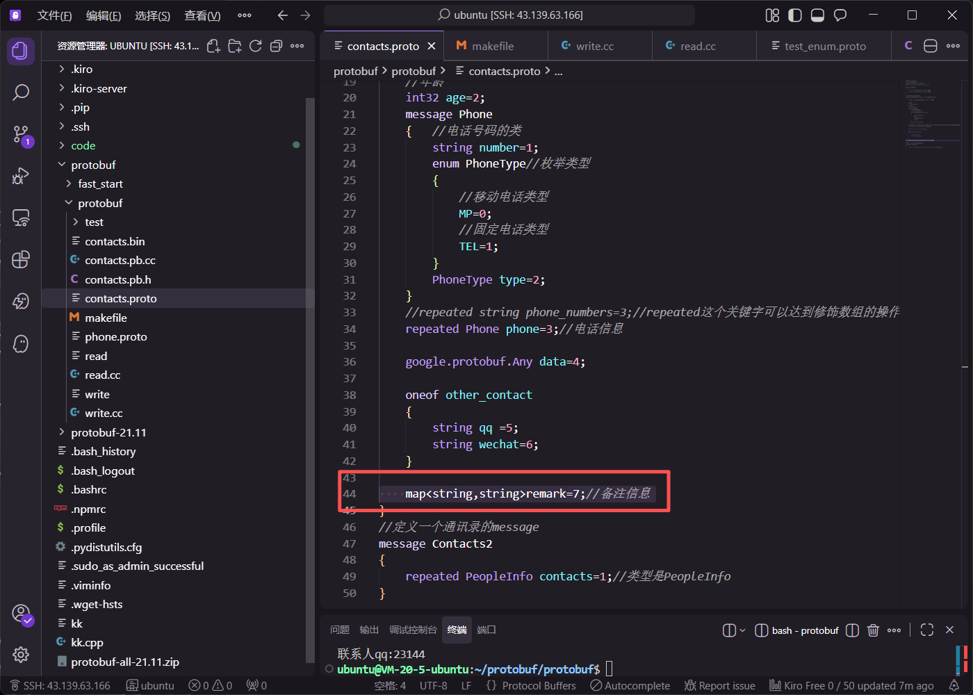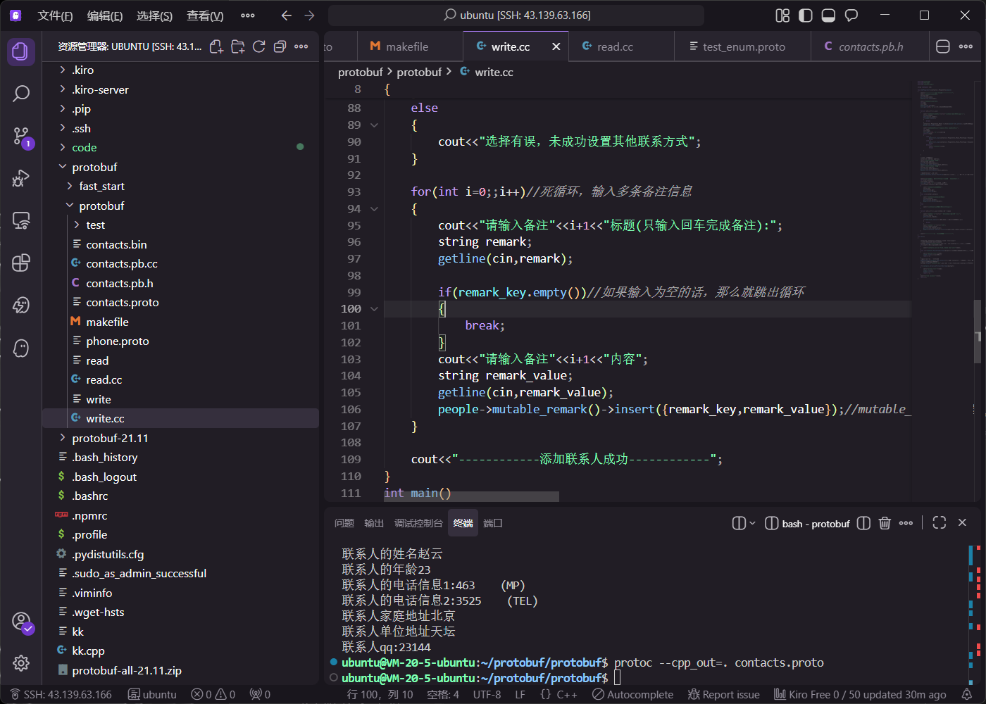在 write.cc 中,通过循环让用户输入多条备注信息。调用 mutable_remark() 获取 map 指针后,使用 insert 方法插入键值对。