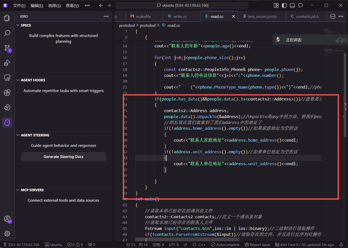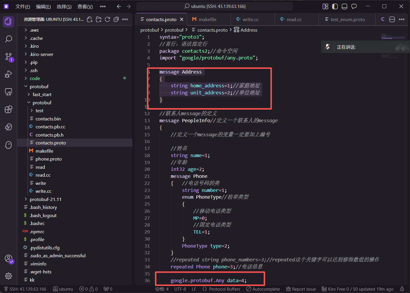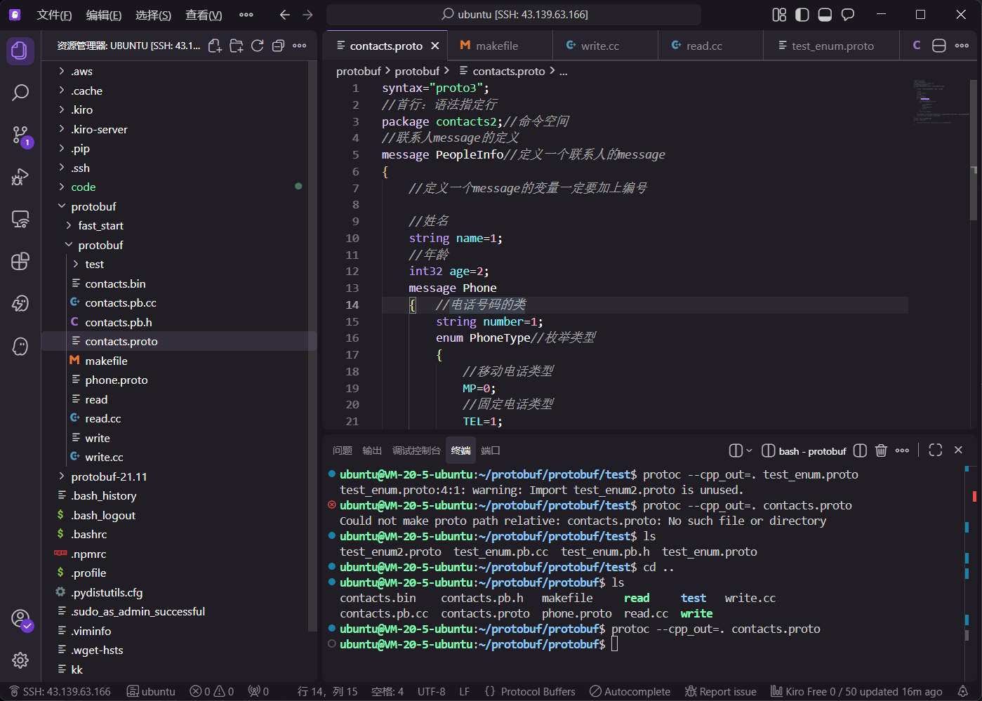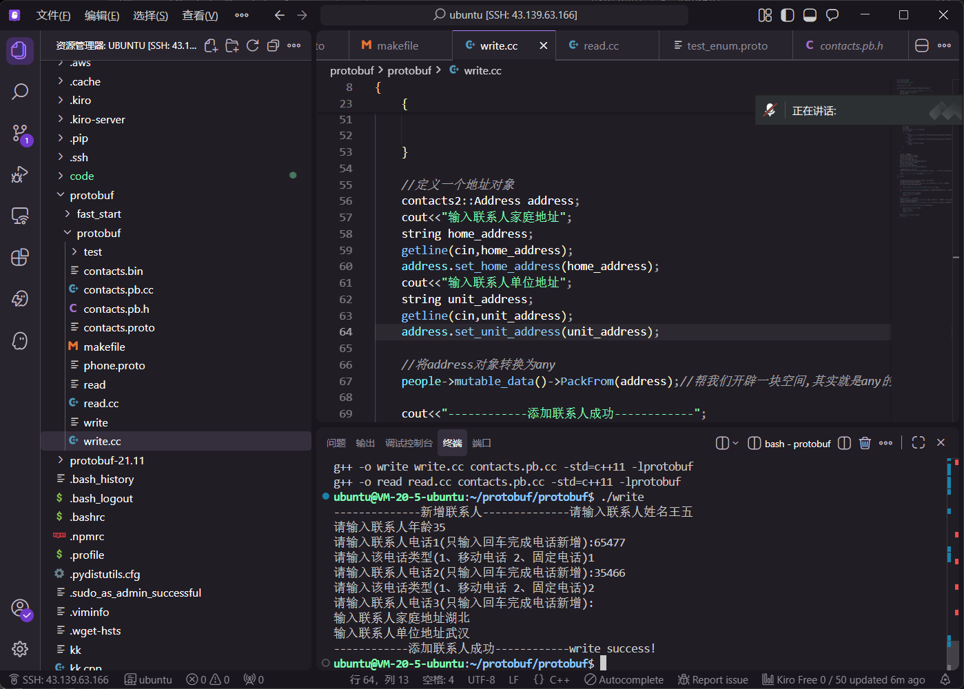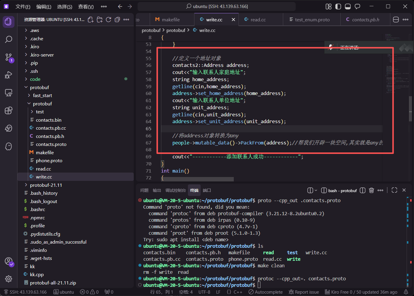 在 write.cc 中,通过循环让用户输入多条备注信息。调用 mutable_remark() 获取 map 指针后,使用 insert 方法插入键值对。