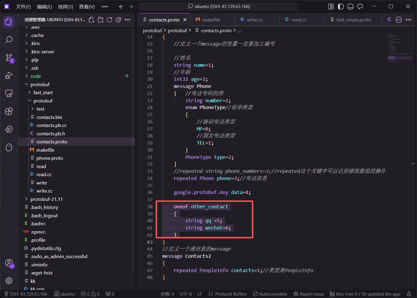这种定义意味着 qq 和 wechat 共享内存空间(逻辑上),设置其中一个会自动清除另一个。下图展示了 proto 文件中 oneof 字段的定义: