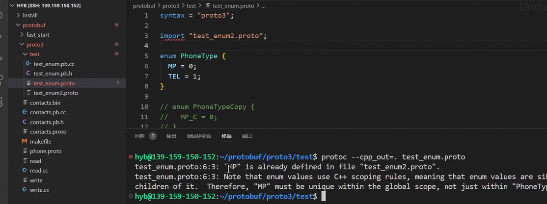 此外,若在另一个独立的 proto 文件中也定义了相同的枚举常量 MP,当当前文件使用 import 引入该文件时,同样会触发跨文件的符号冲突,导致编译失败。下图展示了引入外部文件导致重复定义的错误场景: