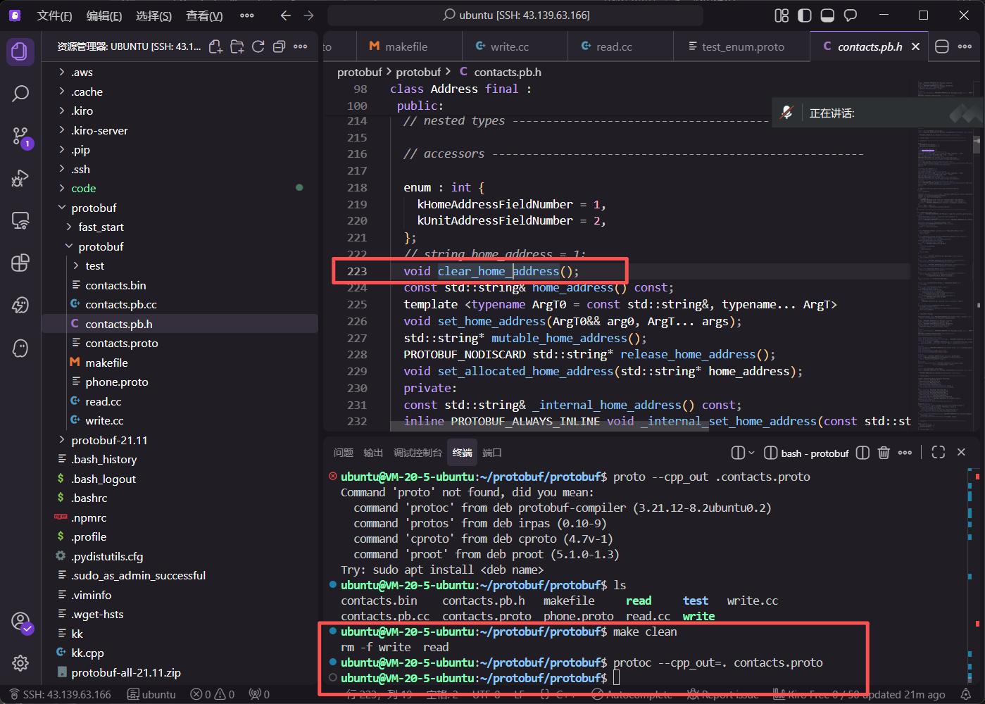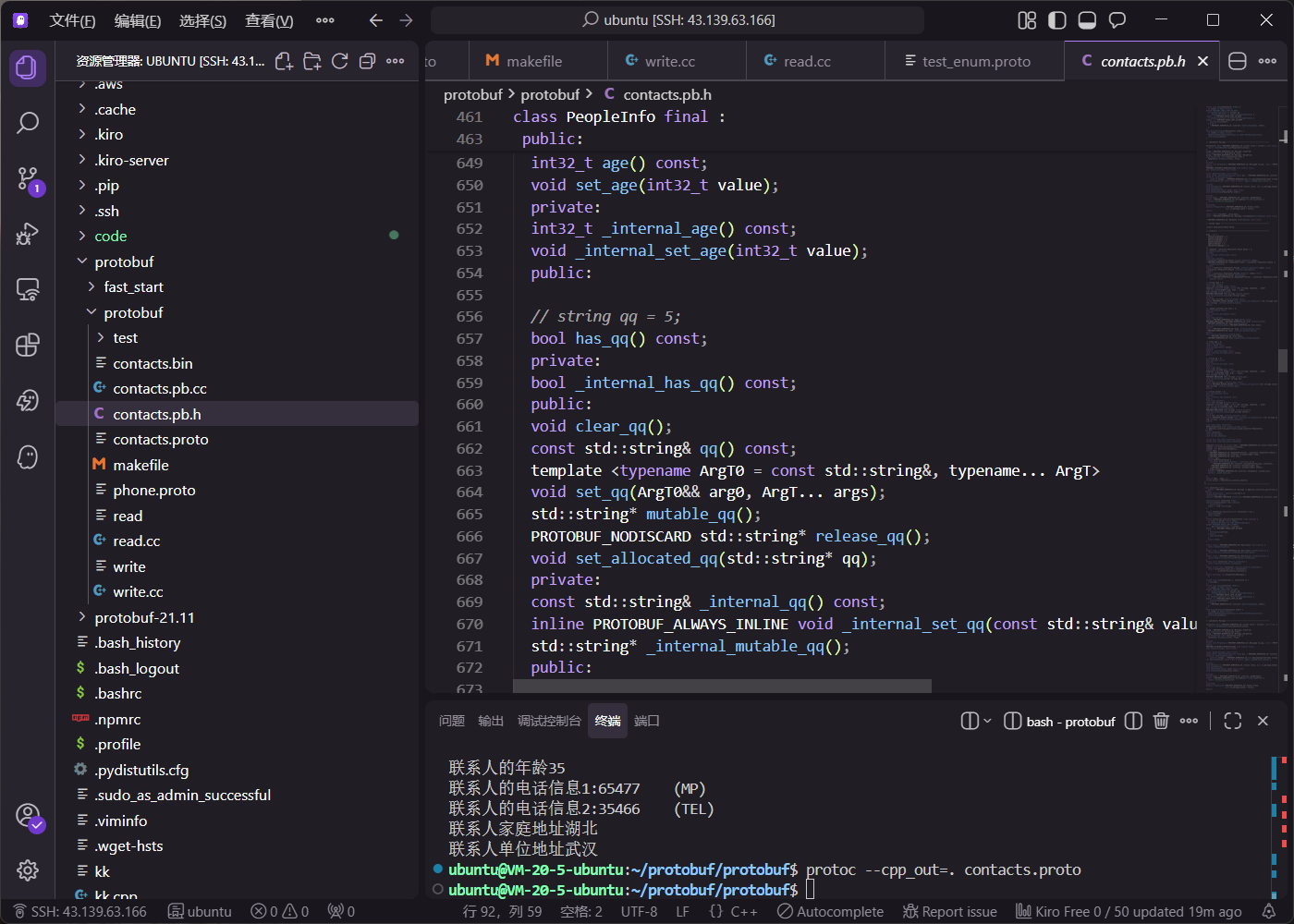 编译操作顺利完成,生成了 contacts.pb.h 和 contacts.pb.cc 文件。