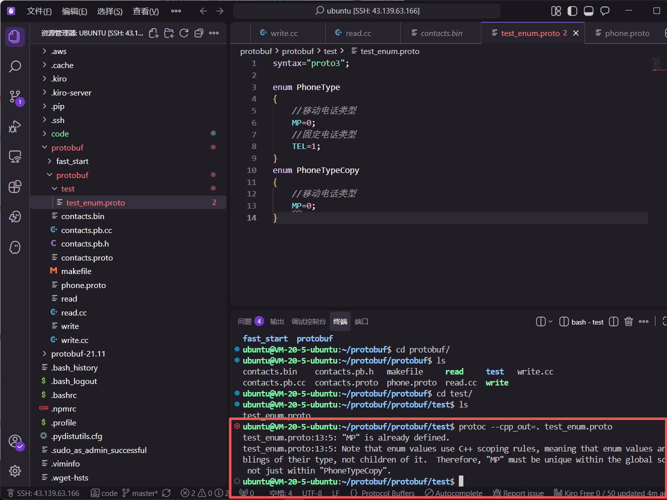 在 Protobuf 的语义中,如果在同一个 .proto 文件内定义的两个 message 中包含完全相同的枚举元素名称,或者在不同的 .proto 文件中定义了重复的枚举常量(例如均为 MP),编译器会抛出重定义错误。这是因为生成的 C++ 代码会将枚举常量映射到外层作用域,导致符号冲突。