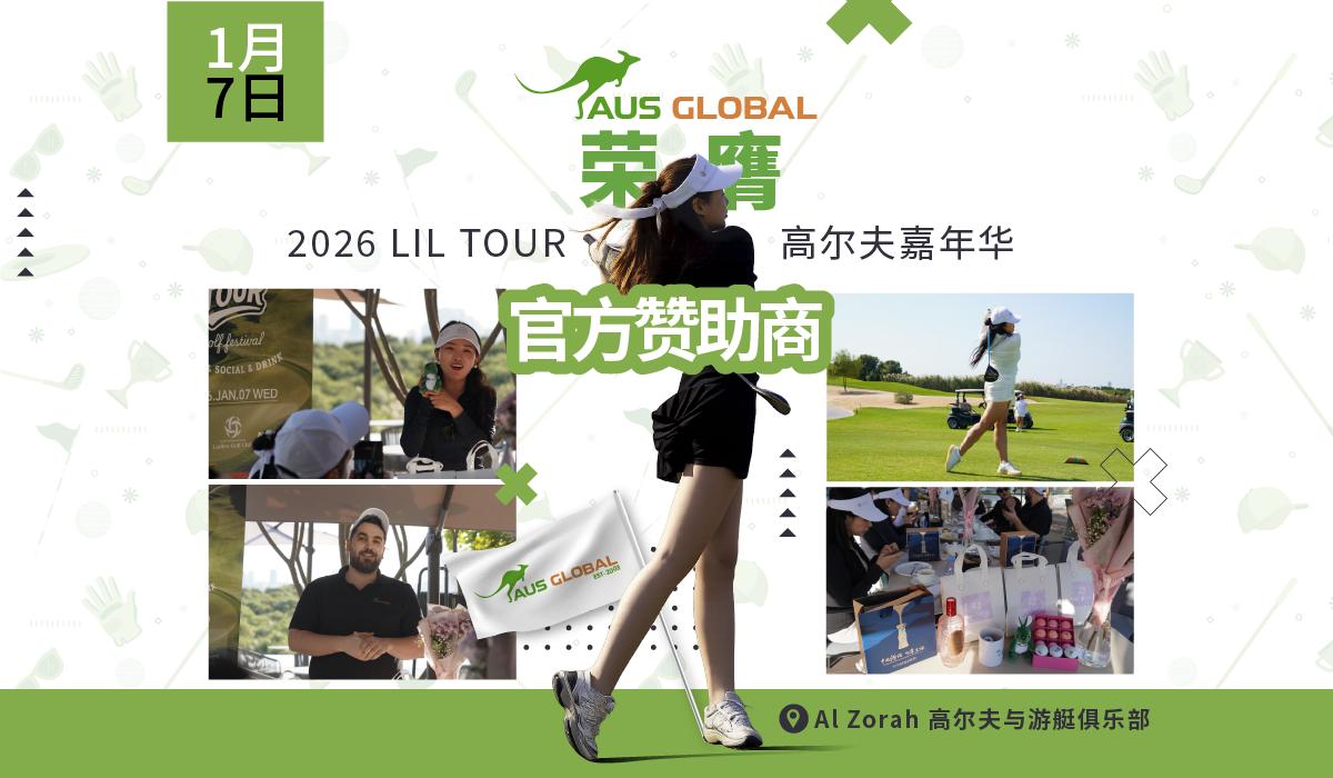 AUS GLOBAL(澳洲环球) 荣幸以官方赞助商 身份参与 2026 LIL TOUR 高尔夫嘉年华 。该高端高尔夫与社交盛会于 2026 年 1 月 7 日 在备受赞誉的 Al Zorah 高尔夫与游艇俱乐部 盛大举行。