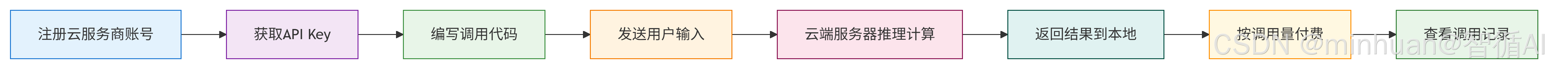 云端调用的核心,是把"推理"环节放在云服务商的服务器上完成,用户只需要负责"输入"和"接收输出"。下面是详细的执行流程,同样用流程图展示,再拆解说明。