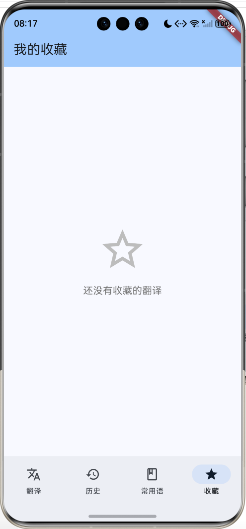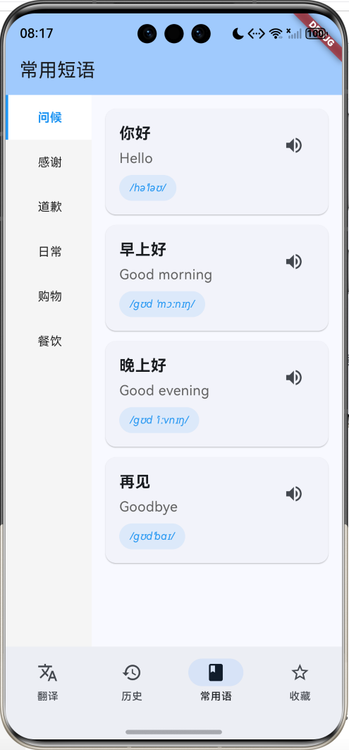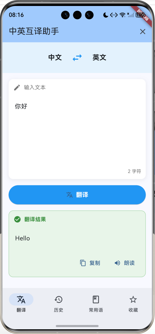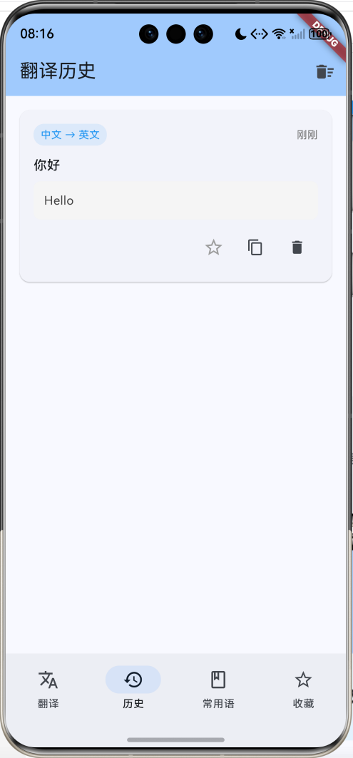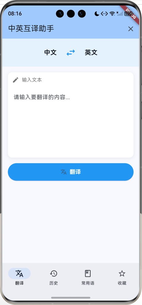这是一个使用Flutter开发的中英互译助手应用,提供实时翻译、历史记录、常用短语和收藏管理等功能。应用采用本地词典的方式实现翻译,无需网络连接,适合学习Flutter文本处理和数据管理。
