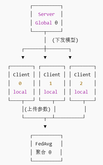 在联邦学习中,Server 不训练模型,只做调度与聚合;Client 不共享数据,只做本地训练。