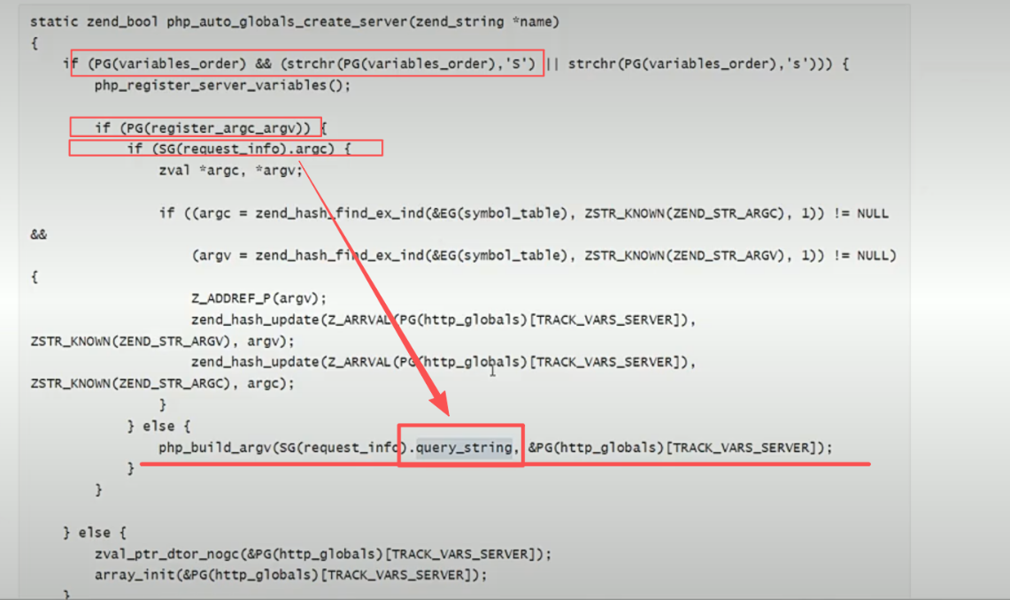 第一个if判断variables_orders中是否有S,即变量$_Sever;第二个判断是否开启了register_argc,第三个判断是否有request_info.argc,若不存在执行: