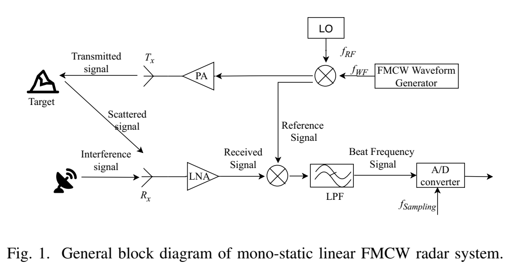 图 1 展示单站线性 FMCW:波形发生器 → 发射 → 目标散射/干扰叠加 → 接收 → 与参考信号混频(dechirp)→ 低通滤波(LPF)→ ADC 采样得到 beat 信号。关键点在于:dechirp 把"距离延迟"变成"固定 beat 频率",从而在一个 sweep 内,目标 beat 的数学形态非常接近"固定频率复指数之和"。这就是后面 MP 能用的根基。