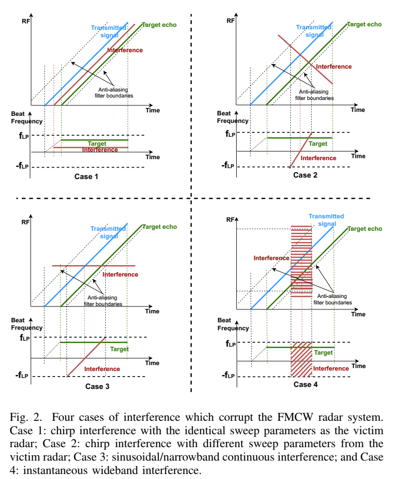 图 2 把干扰分四类,其中 Case 2/3/4 都有一个共同的工程事实:干扰 dechirp 后的 beat 频率是随时间变化的直线(chirp-like),而接收链有低通/抗混叠滤波器,只有其瞬时频率落入 [−fLP, fLP][ -f_{\text{LP}},\,f_{\text{LP}}][−fLP,fLP] 的那段才会出现在 ADC 输出里,因此表现为短时间"污染片段"。文章主要以 Case 2(斜率不同的 FMCW 干扰)为代表来推导。