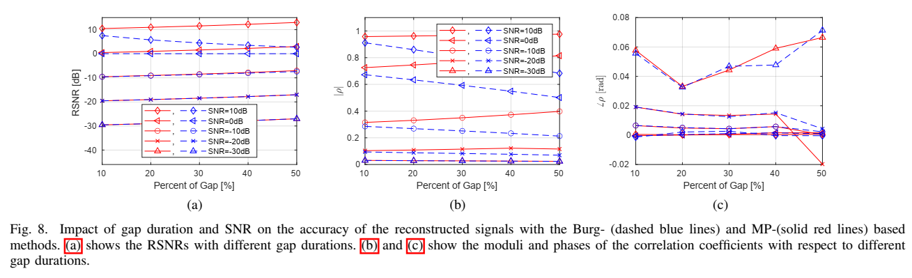 因此"缺口"理论上也应当符合这组指数模型;只要能从缺口两侧的干净数据稳健估计出 {zi,ai}\{z_i,a_i\}{zi,ai},缺口内就能被模型补回。文章选择矩阵铅笔法(MP)来估计极点 ziz_izi,再用最小二乘估计系数 aia_iai,并引入一个"迭代融合"机制:每次先用模型补全缺口,再用真实数据把缺口两端"钉住",用这条变成连续的序列重新估计模型,反复迭代直到两端拟合误差不再下降。这个迭代在低 SNR、缺口很长时尤其关键,是其相对 Burg/IVM 的主要优势来源。
