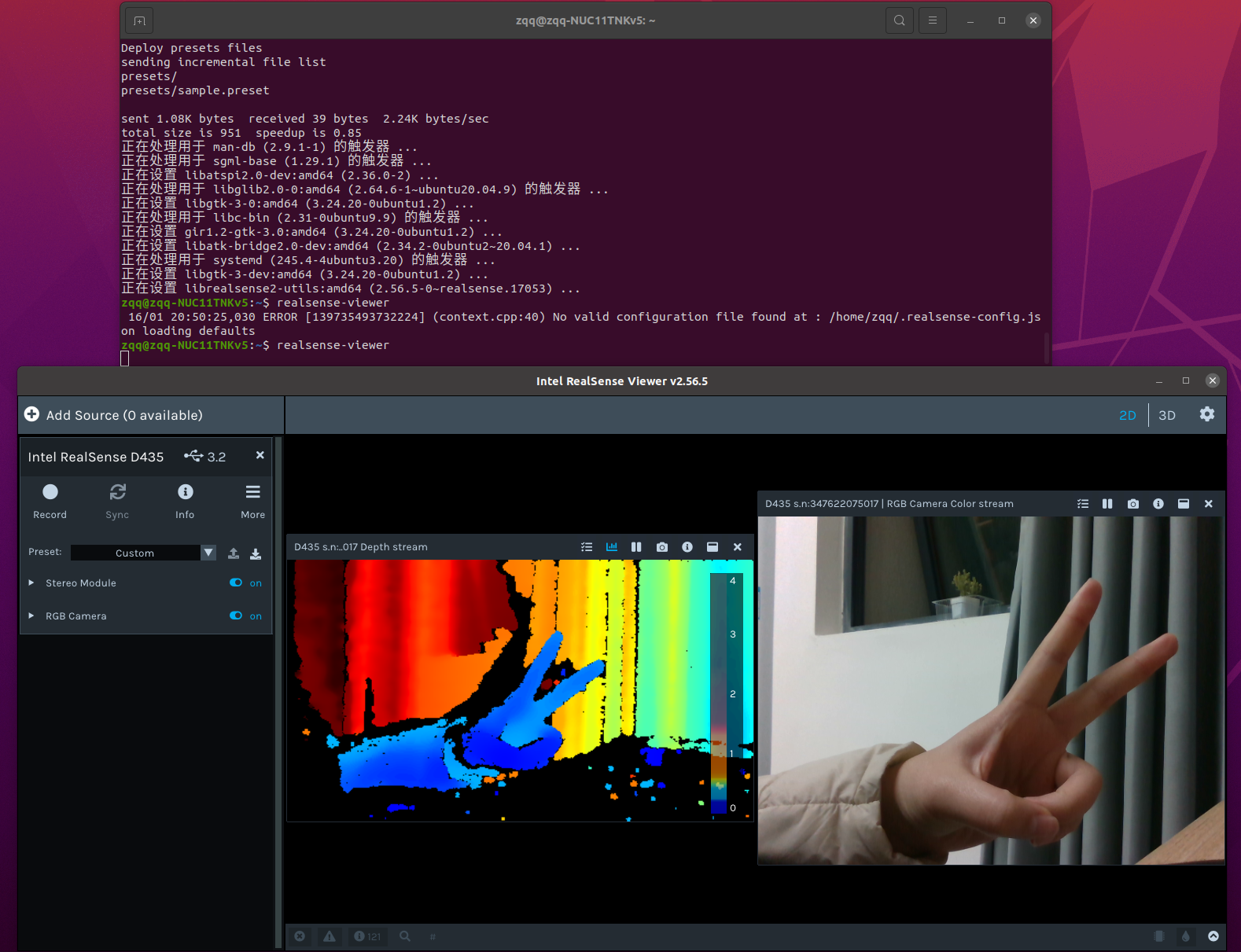 bashrealsense-viewer如果弹出一个窗口,左边有个开关,打开后能看到彩色画面和深度画面(花花绿绿的),恭喜你,驱动装好了!