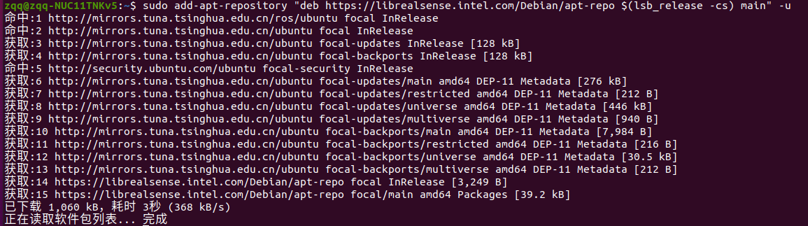 bashsudo add-apt-repository "deb https://librealsense.intel.com/Debian/apt-repo $(lsb_release -cs) main" -u3. 安装驱动库