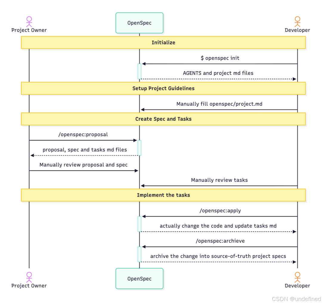 它的工作流是强制性的、结构化的。根据资料,其核心是一个四步循环:1. 起草提案 -> 2. 审查对齐 -> 3. 实现任务 -> 4. 归档更新。关键在于,在写第一行代码之前,我必须先和AI把"要做什么"写成一份明确的规范文档(Spec)。这份Spec会详细定义需求、接口、边界条件,甚至UI细节。只有等我批准了这份"合同",AI才会开始执行编码任务。