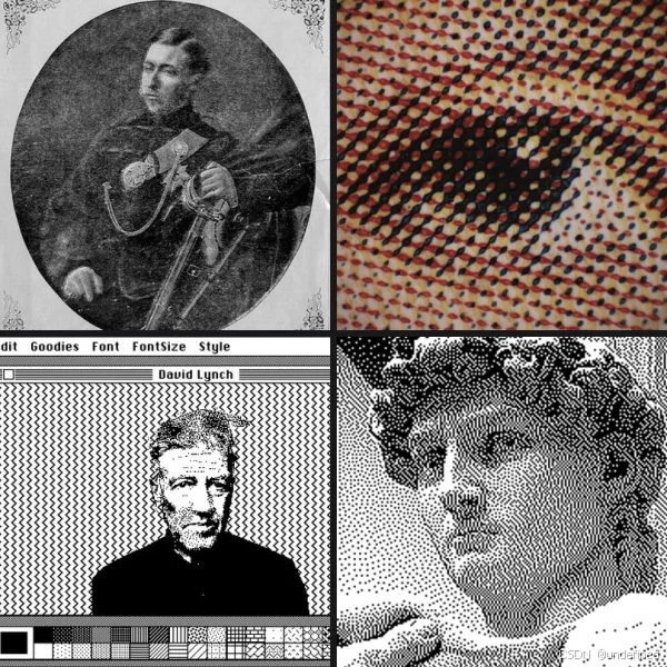 这种技术来自报纸。在数字化普及之前,印刷厂必须思考如何仅用黑色墨水在白纸上重现照片。它们的解决方案是半色调(halftones):用大小不一的细小墨点来欺骗眼睛,使人眼看到连续的色调变化。