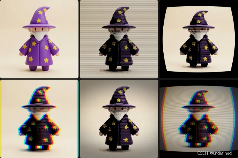 原图、扫描线、曲率、色差、暗角,以及所有效果的组合。