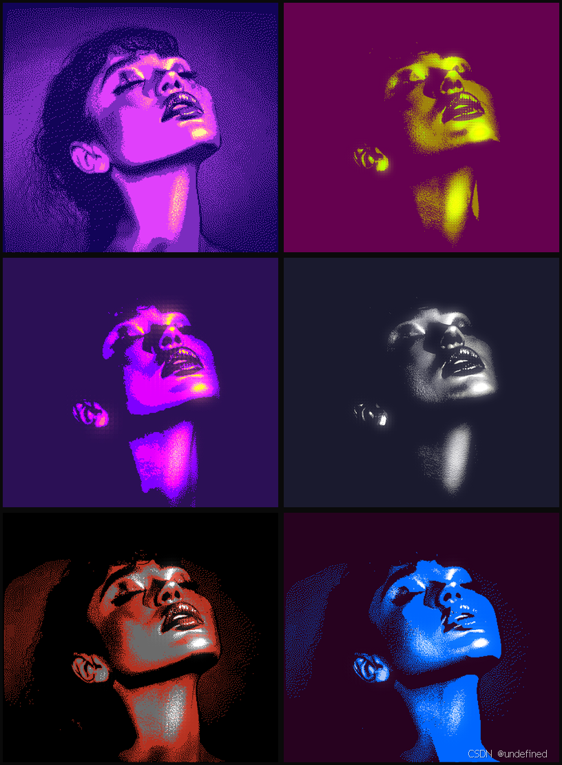 1, 0, 1\], // right \[2, 0, 1\], // two right \[-1, 1, 1\], // bottom-left \[0, 1, 1\], // bottom \[1, 1, 1\], // bottom-right \[0, 2, 1\], // two below \], divisor: 8, // 6 neighbors × 1 = 6, but divisor is 8 } 注意只有 6/8 的误差被分配。那"丢失"的 25% 就是 Atkinson 分布图独特之处。 **试试 Bill Atkinson(初代 Macintosh)中提出的抖动算法。** **Jarvis--Judice--Ninke** 将误差分配到 3 行的 12 个相邻元素。虽然速度较慢,但可以生成更平滑的渐变: 你的浏览器不支持 video 标签。 *Jarvis--Judice--Ninke 动图。注意梯度有多平滑。* **试试 Jarvis--Judice--Ninke 的 12 个相邻元素算法以获得超平滑的梯度:** 我最终实现了 8 种不同的算法。每一种都有自己的风格。哪一种最好看取决于图片本身。 ### **添加颜色** 双色抖动(黑白)是经典,但多色调板则打开了更多可能。Efecto 包含 31 个预设调色板,按类别组织:经典终端色、暖色系、冷色系、霓虹/合成波、土壤色和单色。你也可以创建 2 到 6 种颜色的自定义调色板。 你的浏览器不支持 video 标签。 *实时在不同调色板之间切换的演示。* Game Boy 只有四种绿调。仅此而已。但艺术家们却在如此有限的条件下创作出了令人难忘的游戏。有限的色彩反而激发了创造力。 **试试 1989 年经典的 Game Boy 四色调色板** 你选择的色调会彻底改变氛围。暖色调给人怀旧的感觉,霓虹色调给人赛博朋克的感觉,单色色调则给人一种复古印刷的感觉。  *Same portrait, different palettes: synthwave, gold, cyberpunk, noir, campfire, and deep sea.* *同一幅肖像,不同的配色:合成波、金色、赛博朋克、黑色电影、篝火和深海。* Efecto 使用亮度来映射颜色。首先计算每个像素的亮度: **typescript** const luminance = 0.299 \* r + 0.587 \* g + 0.114 \* b 然后将该亮度映射到调色板索引。调色板按从暗到亮的顺序排列,因此暗像素从调色板的开头选取颜色,亮像素从调色板的结尾选取颜色: **typescript** const index = Math.floor(luminance \* palette.length) const color = palette\[Math.min(index, palette.length - 1)