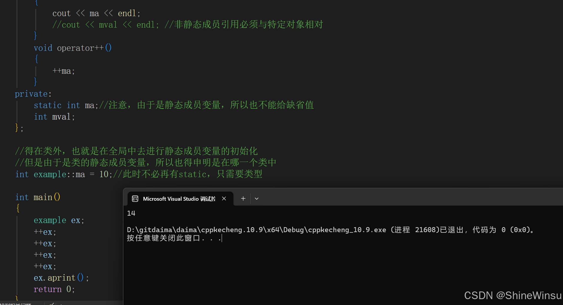 原因:静态成员变量属于类本身(而非某个对象),类的声明仅用于描述成员的存在,不分配内存;而初始化需要实际分配内存并设置初始值,因此必须在类外(其实也就是全局中)(通常是.cpp 文件中)单独完成。