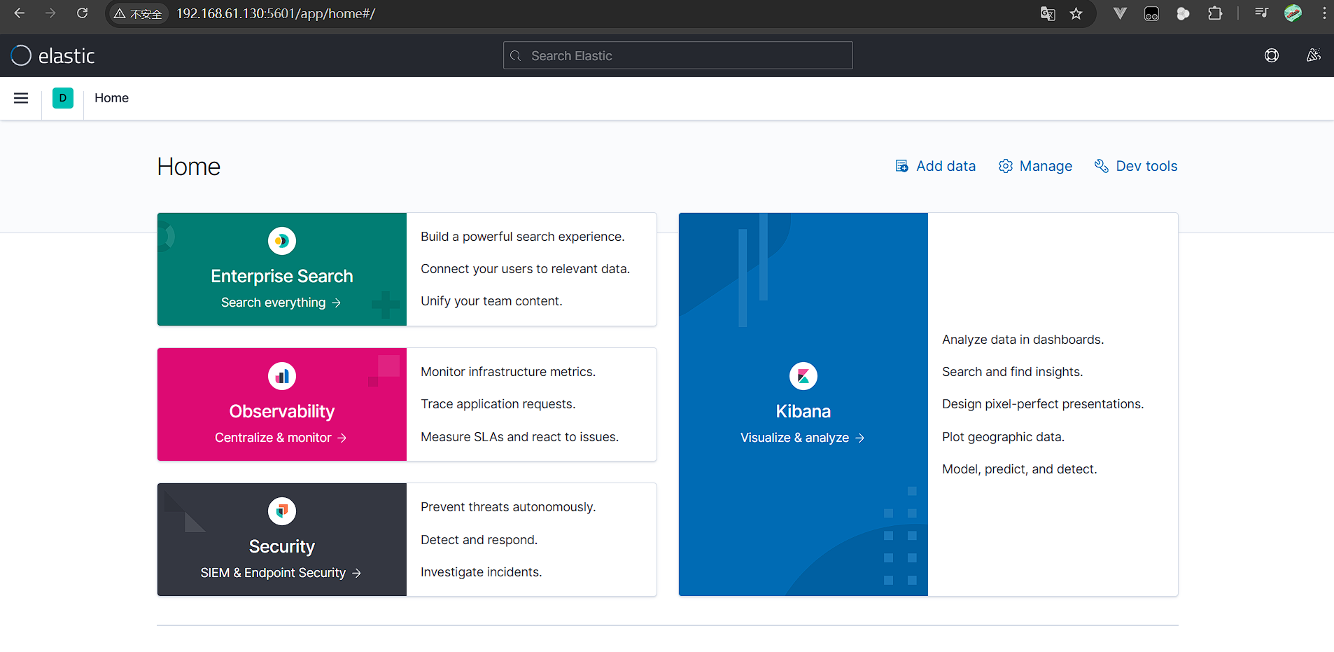 在浏览器输入地址访问:http://192.168.61.130:5601
