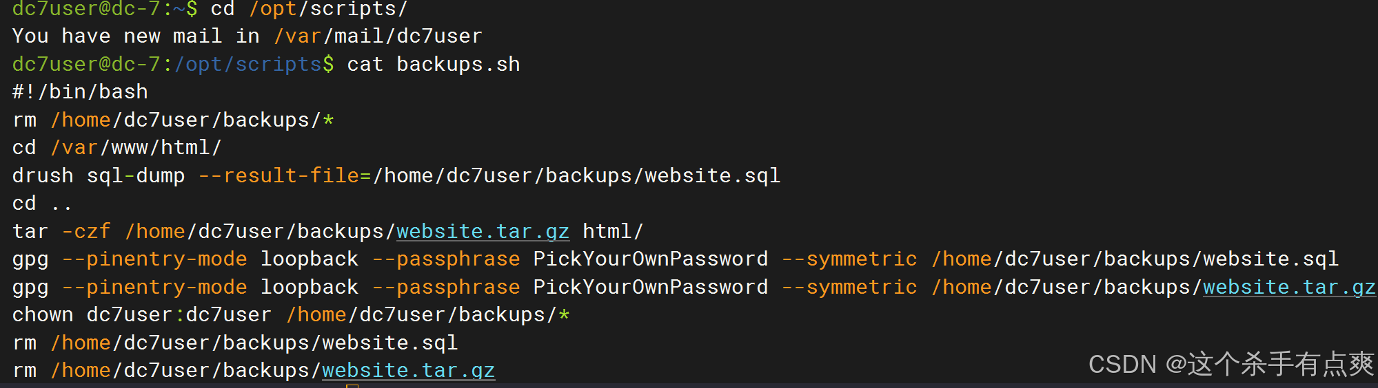 通过脚本的内容,发现drush命令,对数据库进行了操作,以及打包备份操作。