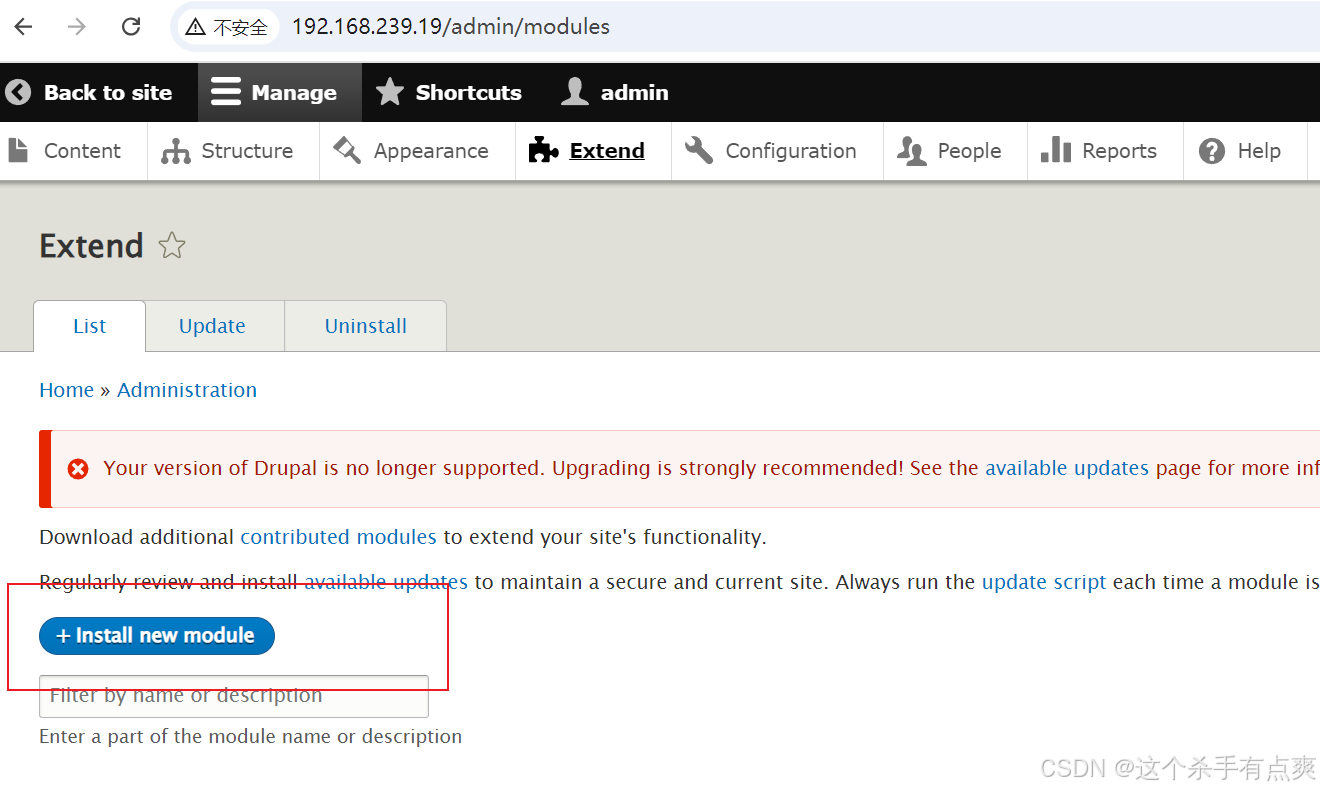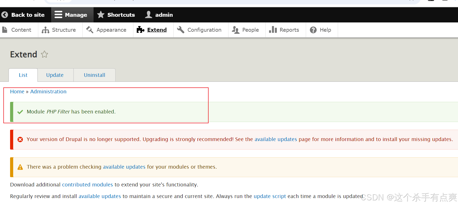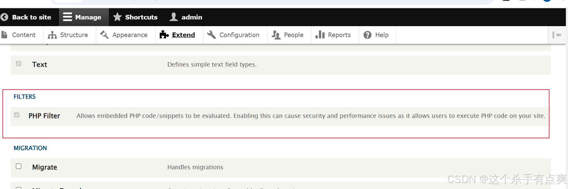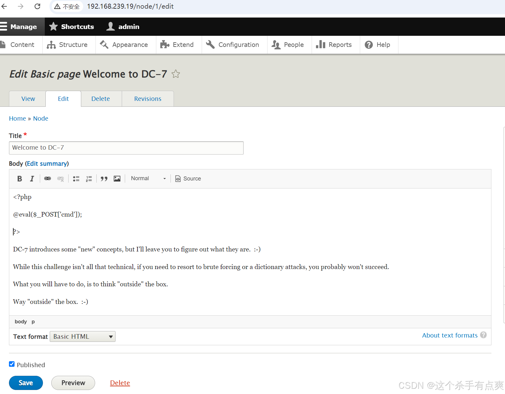 在Content--->Add content-->Basic page下,准备添加PHP代码反弹shell,但发现Drupal 8不支持PHP代码,百度后知道Drupal 8后为了安全,需要将php单独作为一个模块导入