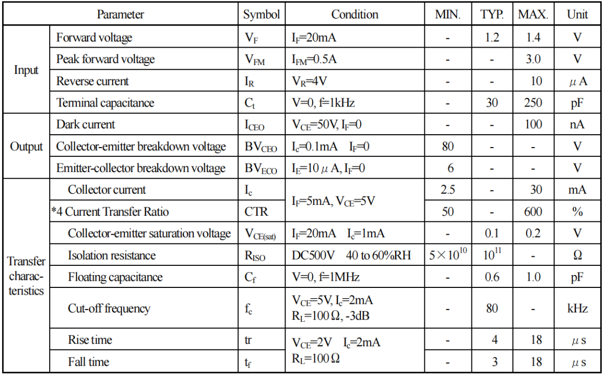 | 输出 | 集电极-发射极击穿电压 | Ic=0.1mA, IF=0 | 80 | - | - | V |