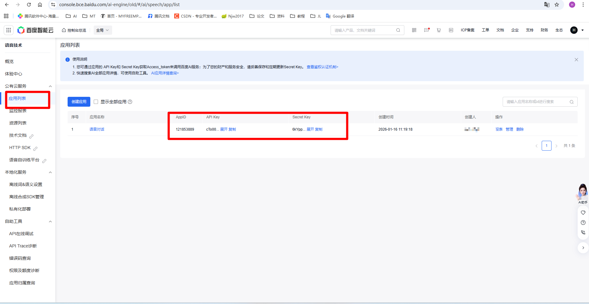 - 获取密钥 进入应用列表,找到并记录 API Key 与 Secret Key ,这两个密钥后续代码中会用到