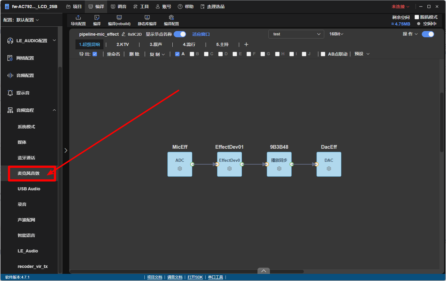 麦克风 → ADC(16kHz) → EffectDev0 节点 → WebSocket 上传