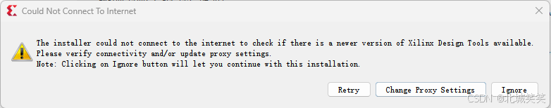 安装程序无法连接到互联网,以检查是否有更新版本的 Xilinx 设计工具可用。请验证网络连接性和 / 或更新代理设置。