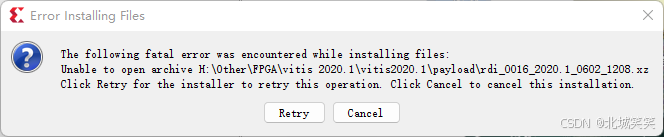 在安装文件时遇到以下致命错误:无法打开归档文件 R:\other\FPGA\vitis 2020.1\vitis2020.1\payload\vrdi_0016_2020.1_0602_1208.xz。