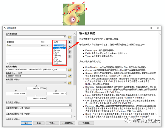 2.如果多个输入点落在一个输出像元内,地形转栅格会将平均值用于插值(仅考虑落入像元内的前 100 个点,其余点将忽略)。如果算法遇到太多点,则可能会出现错误,表明点数据集中的点过多。可用的最大点数为 NRows * NCols,其中 NRows 表示输出栅格中的行数,而 NCols 则表示列数。
