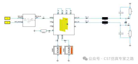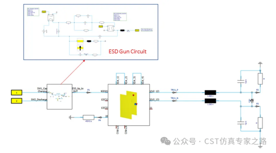 接下来切换到电路工作室,我们使用电路静电枪来替代3D静电枪。为了更好的监控ESD造成的干扰,我们在PCB走线的接收端设置端接电阻及Probe,对信号线上的ESD波形进行监控。