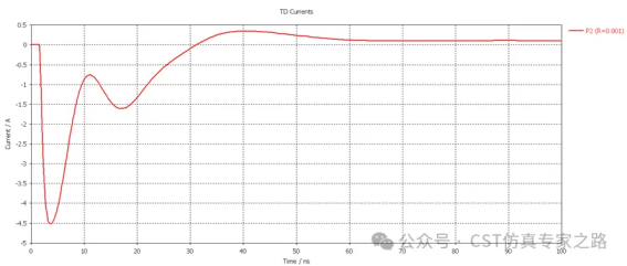 芯片硬失效的结果就是出现击穿短路的情况。ESD击穿时的瞬态电流波形很难去准确的模拟,但是我们可以对ESD击穿后的电流波形进行仿真。假设芯片击穿后的电阻是1毫欧,下图是芯片端击穿后的电流波形,峰值电流达到了4.5A。