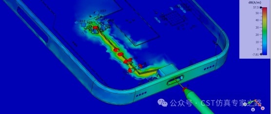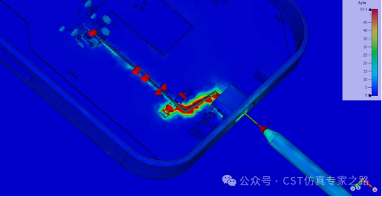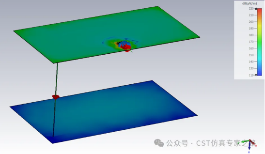 首先我们来仿真没有TVS管的情况。通过设置电场监视器,可以清楚地看到手机内部及周围的电场分布。