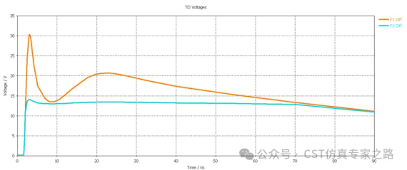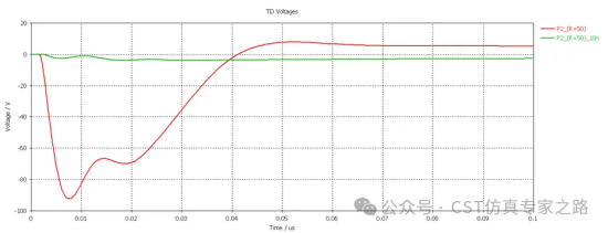 通过电路中芯片处探针P2的结果可以看出,增加TVS管之后,芯片端残压降到10V以内,ESD隐患解除。
