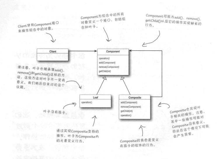 现在,调用菜单或菜单项上的某些方法可能没有意义,但我们可以处理,只需等一会。目前,我们快速浏览一下菜单如何符合组合模式结构: