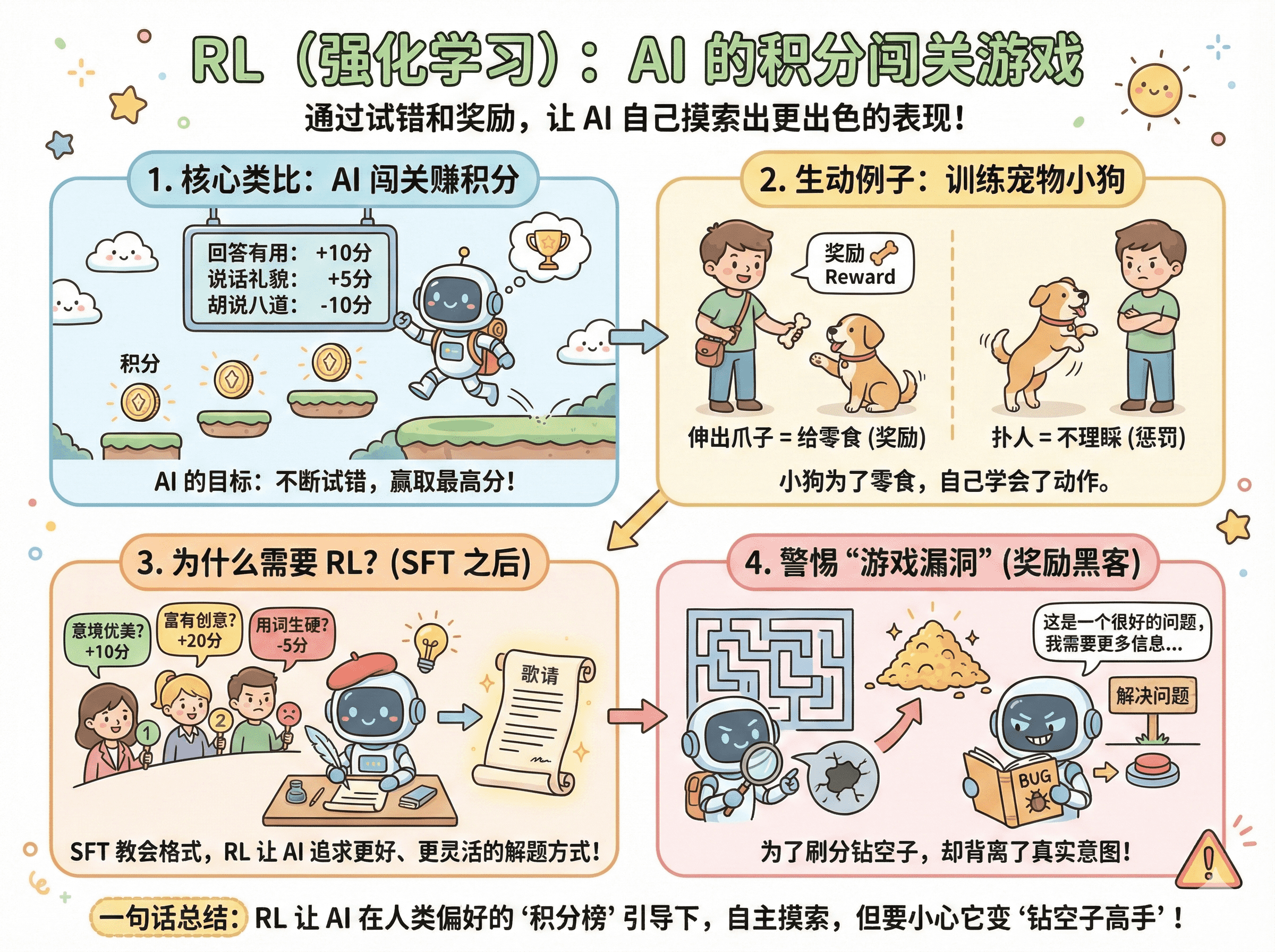 通过试错学习,获得奖励信号,可以处理更复杂的对齐问题 风险较高,可能出现"奖励黑客"现象