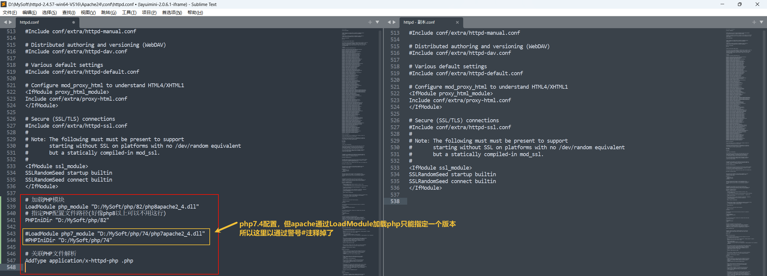 注意如果是php8以下,则LoadModule php_module需要修改为LoadModule php7_module如php7.4,则应该是