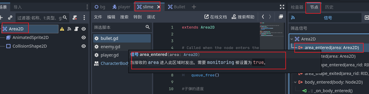 - 如何检查史莱姆被子弹打到了呢?我们在史莱姆场景的右侧的节点面板找到area_entered信号事件,这个是检测area的碰撞,上一个我们之前做的信号事件是检查body的碰撞,而我们的子弹是area所以我们这里的信号事件是检查area的碰撞