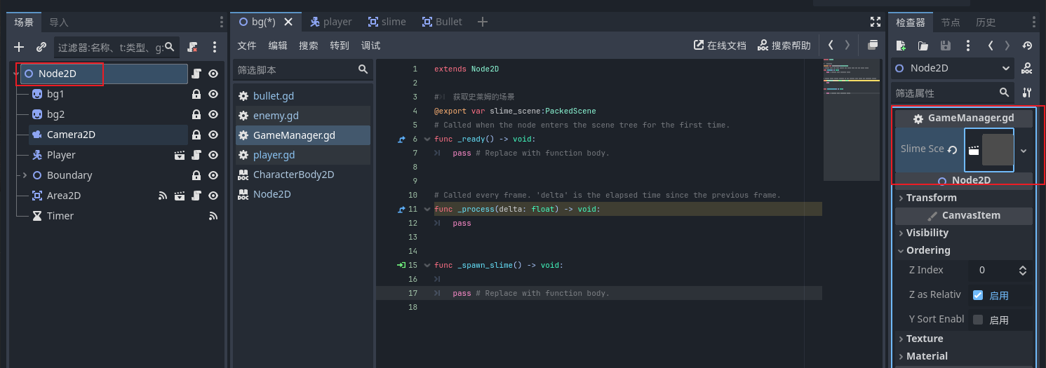 然后我们需要先创建史莱姆场景保存到临时变量,然后生成出来在一个范围的y轴上随机生成出来,然后链接到主场景树中,显示出来