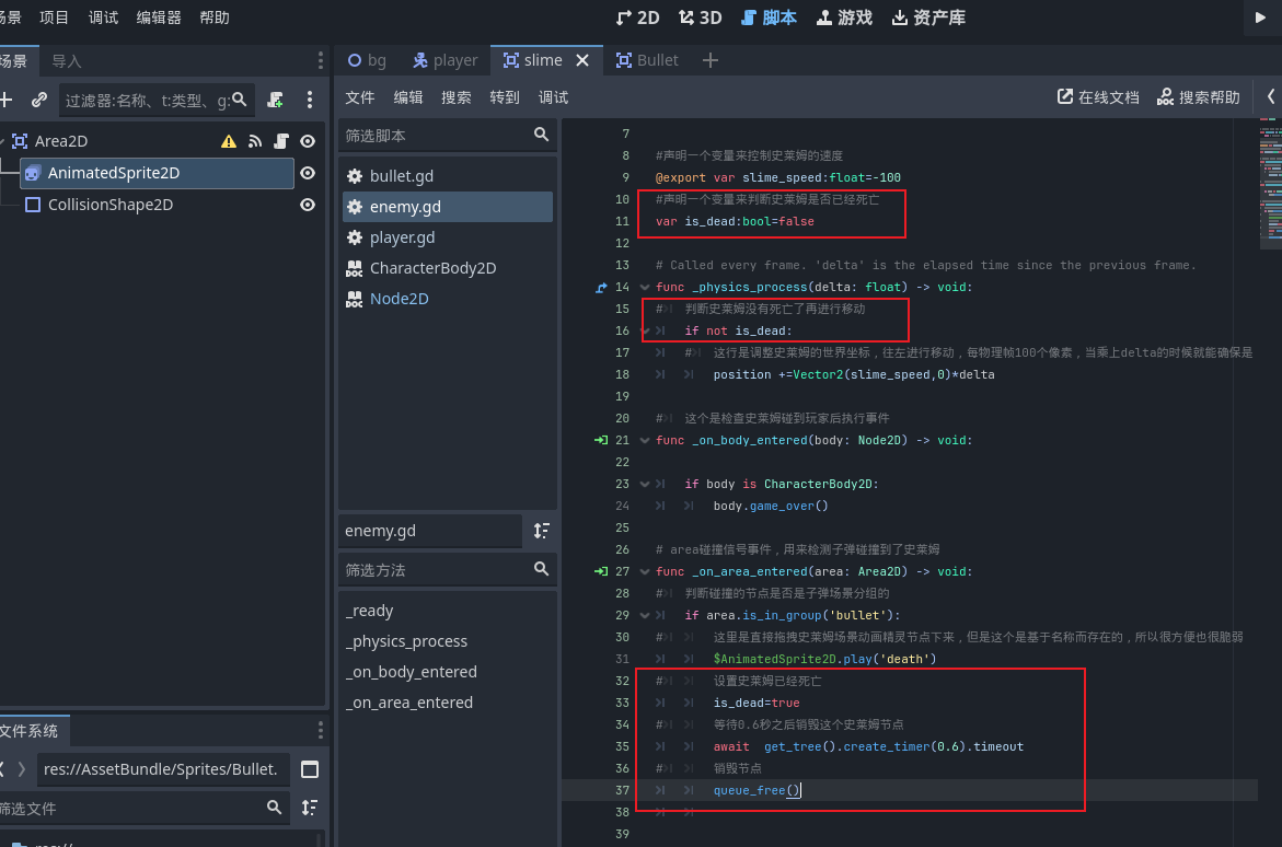 - 然后我们就可以在代码里面写area碰撞是否是子弹场景的,然后呢播放史莱姆死亡动画,因为我们这里史莱姆播放死亡动画是只有一次的,所以我们可以不用创建一个变量去进行播放,我们可以直接拖拽史莱姆场景的动画精灵节点到代码里面去使用,但是这个是基于名称而存在的,所以很方便也很脆弱,你名字一改,那么这个动画播放代码就失效