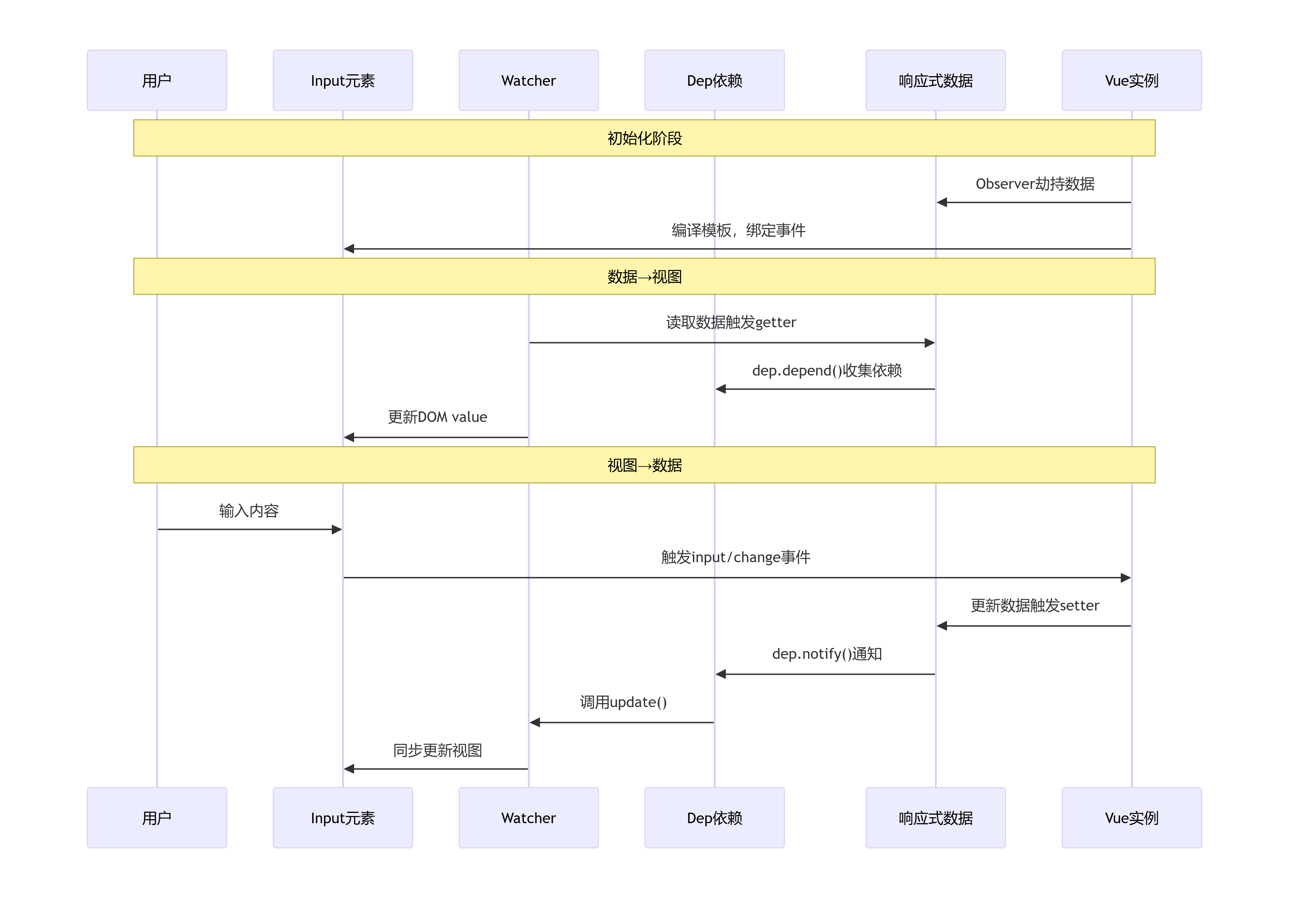 但该机制存在一个固有局限:视图层的用户交互(如输入框修改、按钮点击)不会自动反馈到数据模型,需要开发者通过事件监听机制手动完成数据同步。