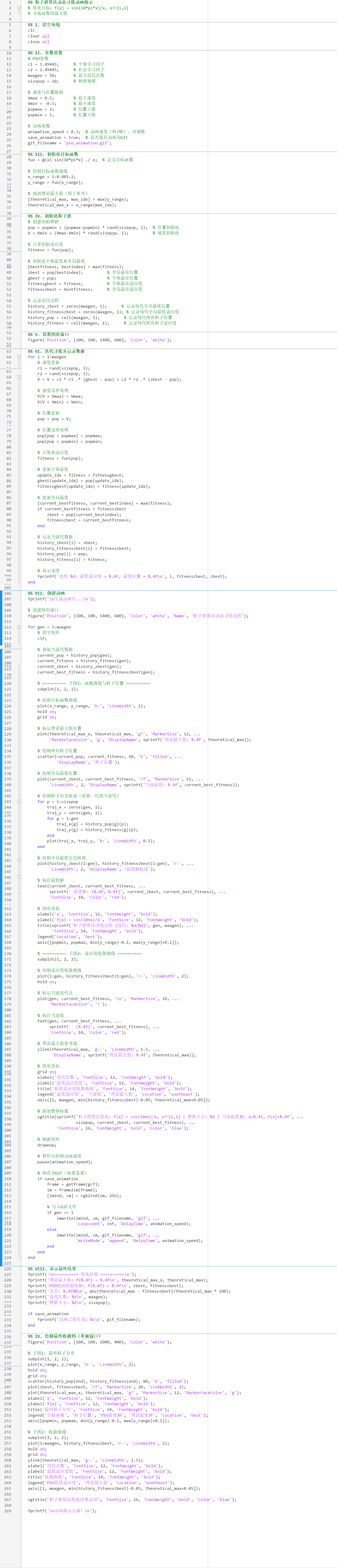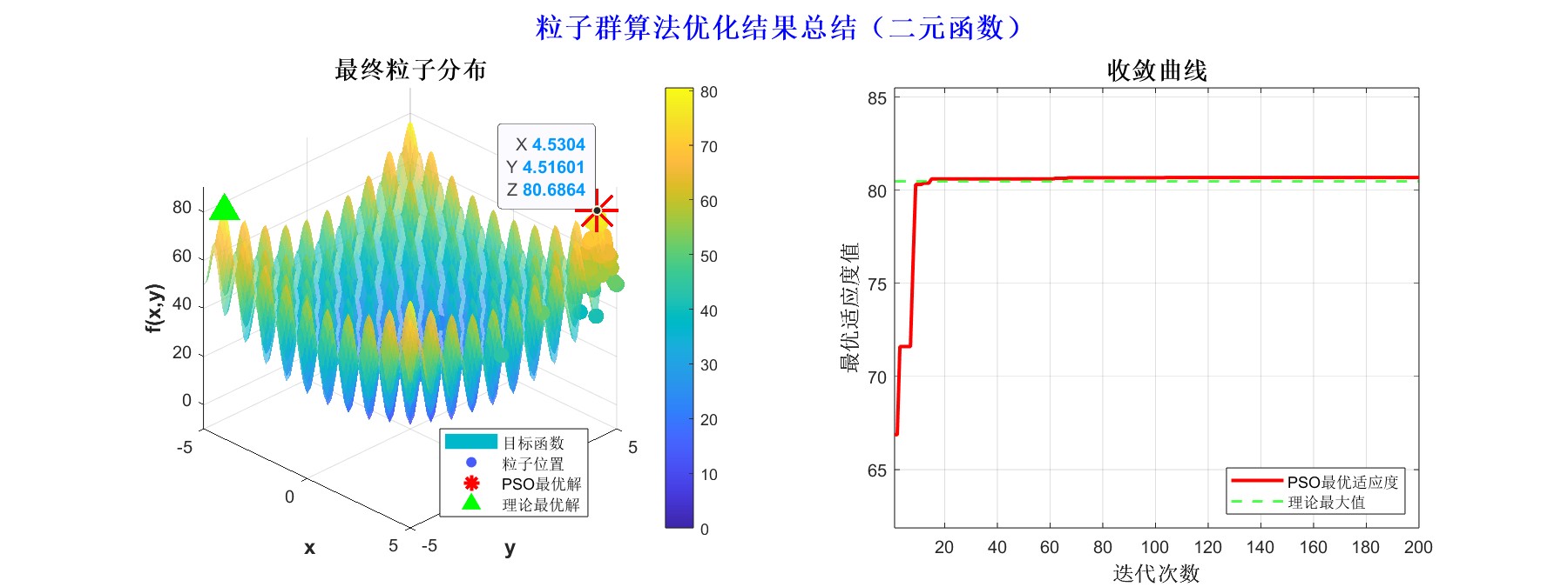 - 关键点:PSO通过粒子间信息共享,快速收敛到函数峰值附近,避免局部极值。