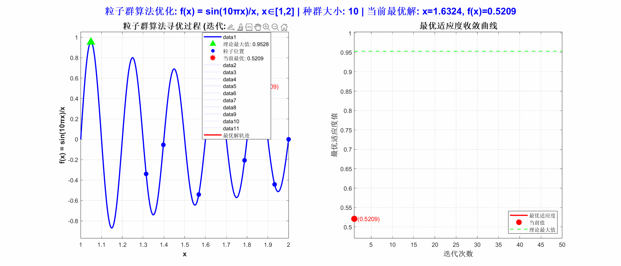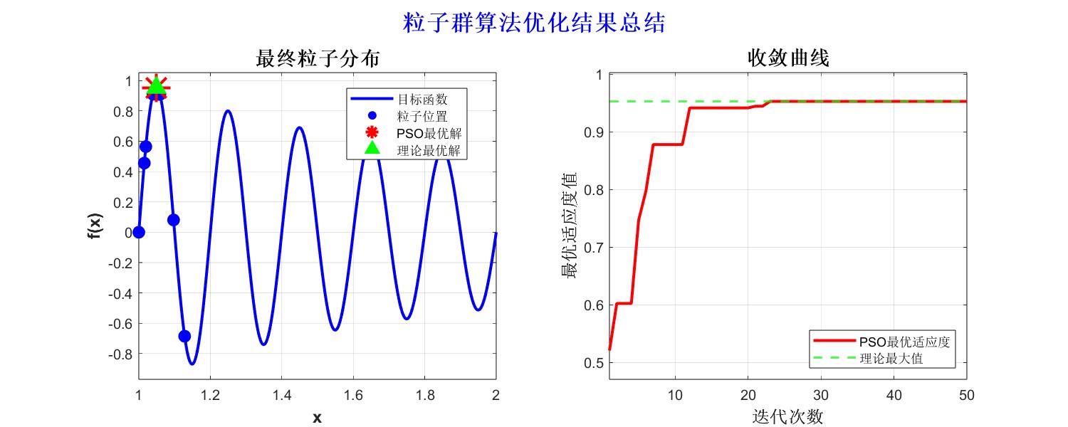 从运行结果可以看出,PSO算法在区间 [1, 2] 内找到了函数的最大值。粒子群在迭代过程中迅速向极值点 x =1.0493聚集,收敛速度快且稳定。这说明算法在处理一维连续优化问题时,具有良好的全局搜索与局部开发平衡能力,能有效避免陷入局部最优,适用于参数调优、曲线拟合等场景。