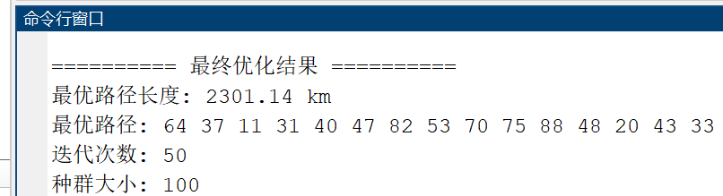从运行结果可以看出,PSO算法通过离散编码方式表示城市访问顺序,成功找到一条较优的闭合路径。运行结果图中路径清晰,且总距离较短,说明PSO在组合优化问题中具有较强的搜索能力。结合局部搜索策略(如2-opt)后,PSO算法能进一步提升路径质量,适用于物流配送、巡检路线规划等实际问题。